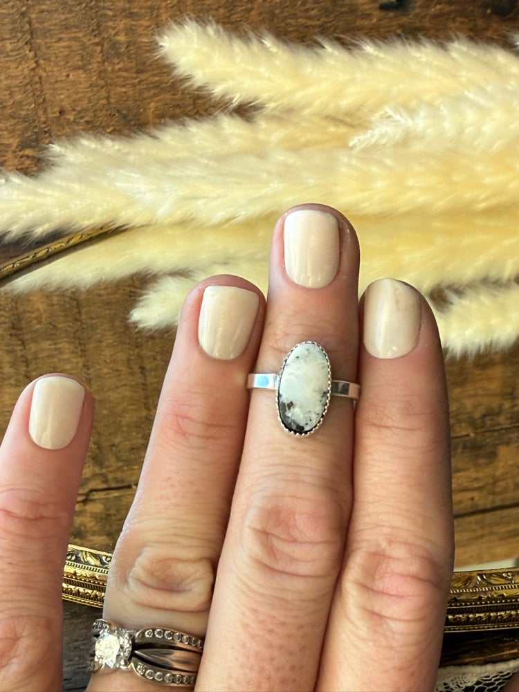 This White Buffalo oval ring features a natural white buffalo stone set in a clean, plain sterling silver band. Soft white tones with subtle black veining give this stone its signature calm, grounded look—simple, striking, and timeless.