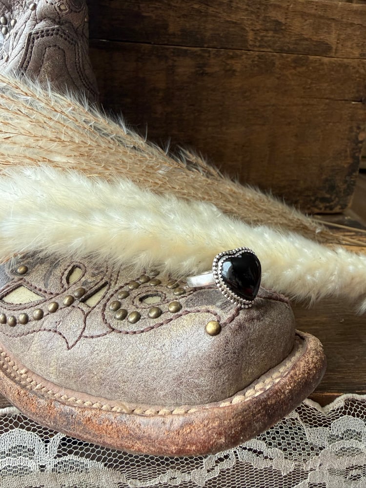 Bold, timeless, and effortlessly western — the Midnight Heart Ring features a striking 12 mm black onyx heart set in sterling silver with hand-placed beaded edging for classic detail and texture.